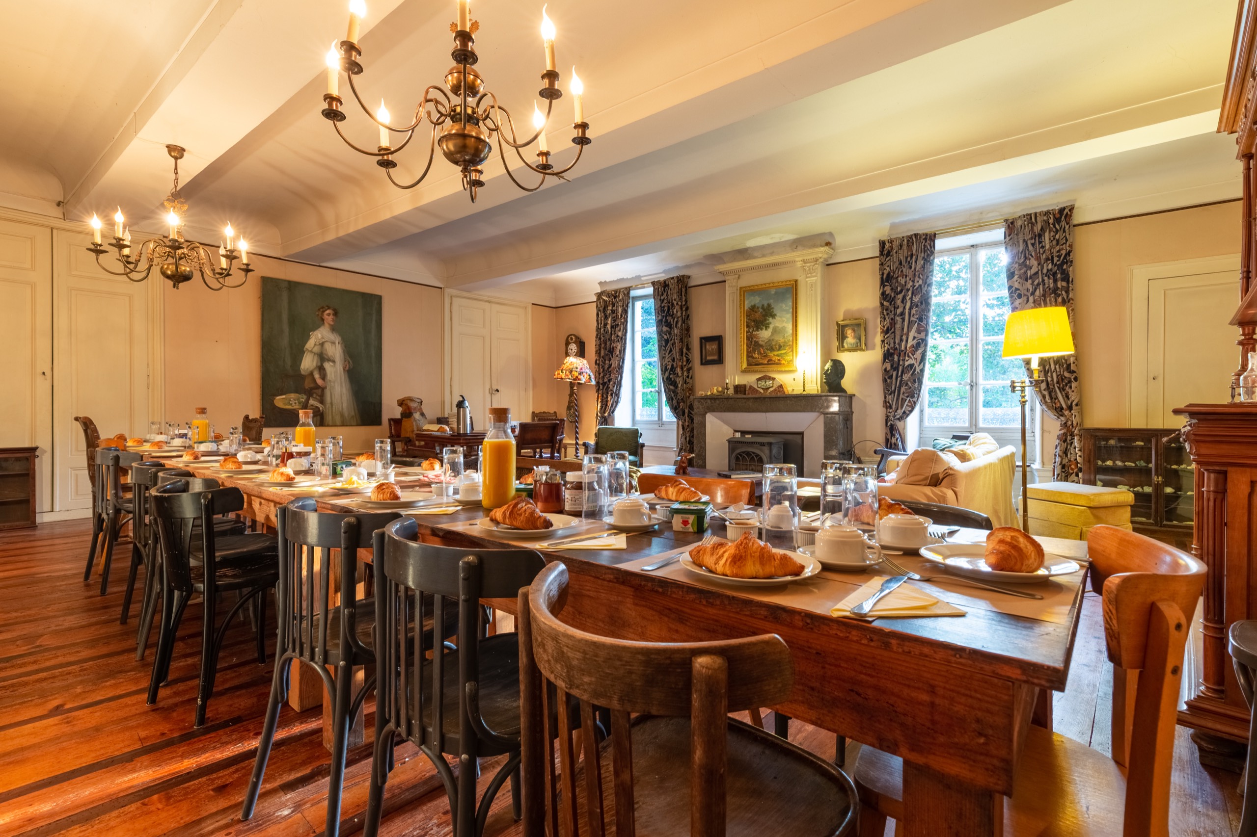Quelques jours par semaine, nous proposons la formule table d'hôte. Le menu se compose de quatre plats : une entrée, un plat principal, un plateau de fromage et un dessert, accompagnés de vin rouge et d'une carafe d'eau. Les jours où il y a table d'hôte, nous nous asseyons ensemble à table à 20h00 dans le Grand Salon au coin du feu de bois crépitant.
